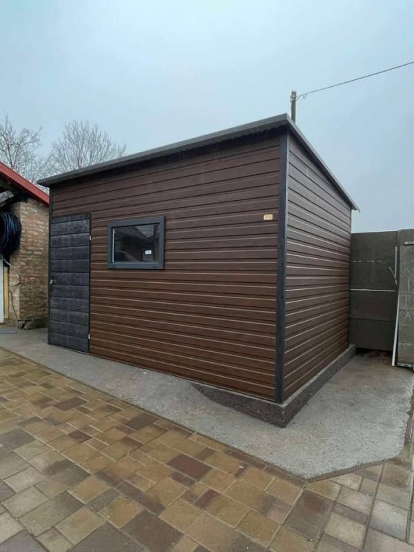 Dach domku narzędziowego został zaprojektowany ze spadkiem do tyłu, co zapewnia skuteczne odprowadzanie wody deszczowej i zapobiega gromadzeniu się śniegu. Dzięki temu domek narzędziowy jest odporny na zmienne warunki atmosferyczne i zachowuje stabilność przez wiele lat użytkowania.