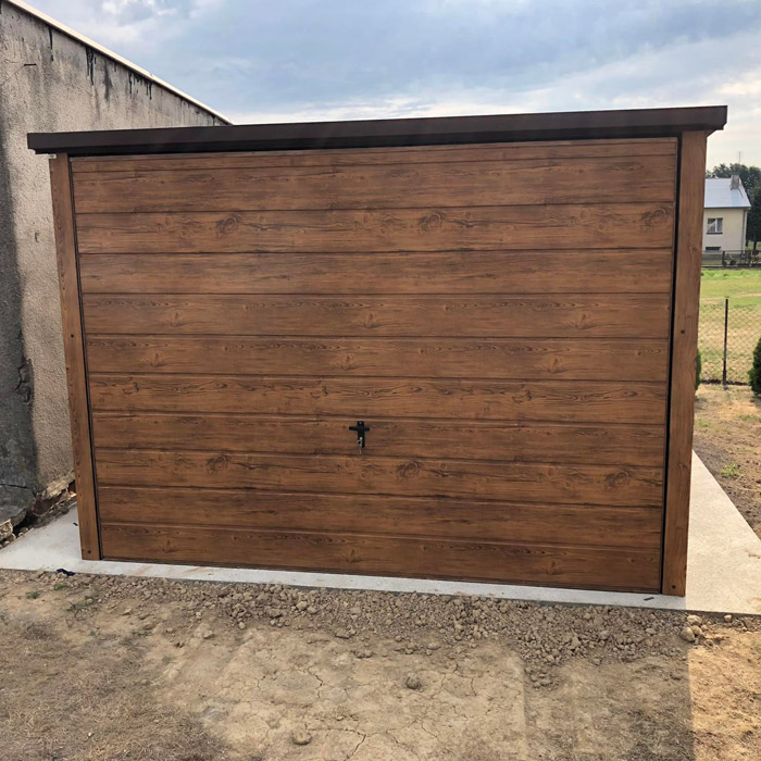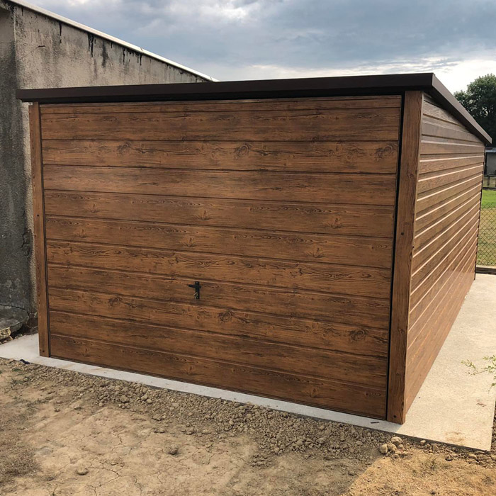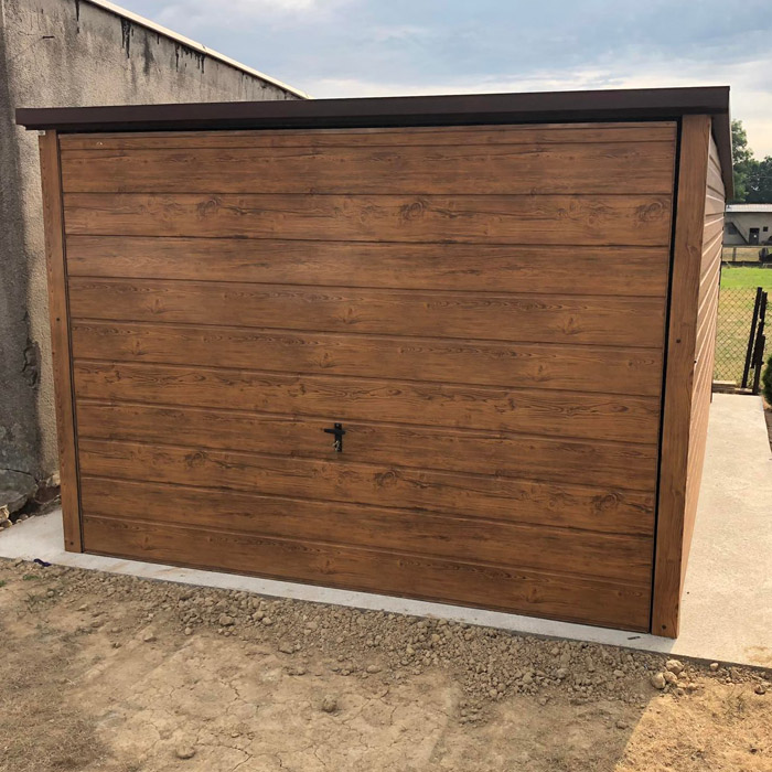 Garaż 3×5, dach jednospadowy, blacha w kolorze drewnopodobnym (złoty dąb). Blacha w przetłoczeniu poziomym wraz z obróbką blacharską narożników oraz dachu. Konstrukcja garażu wykonana z profilu zamkniętego ocynkowanego. Blacha przymocowana nitami w kolorze blachy.