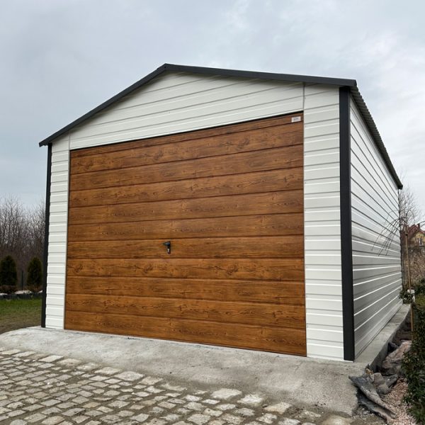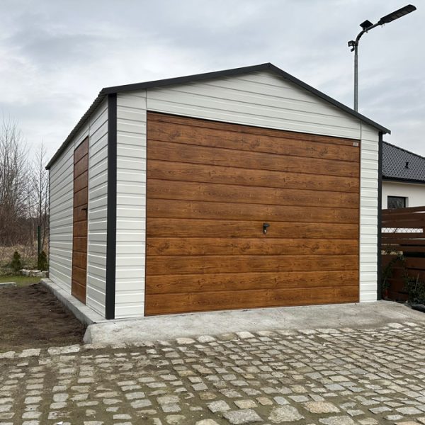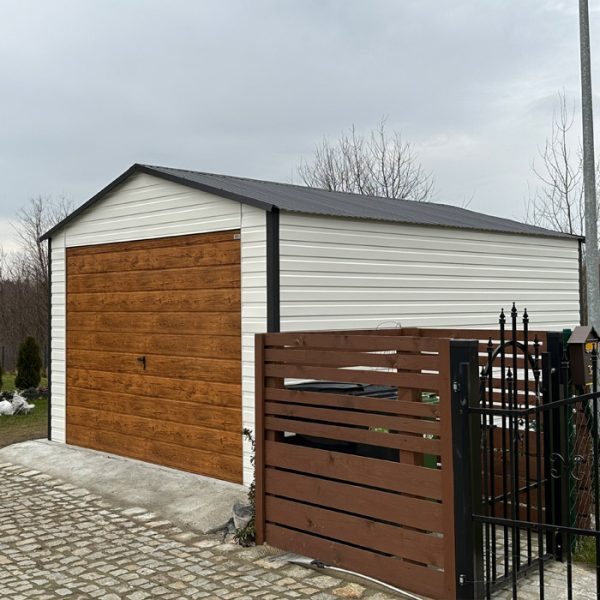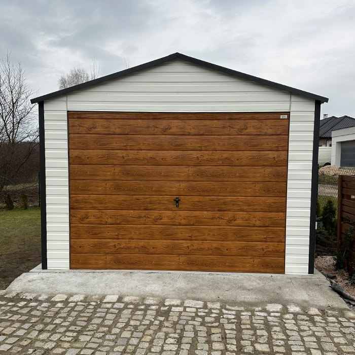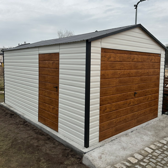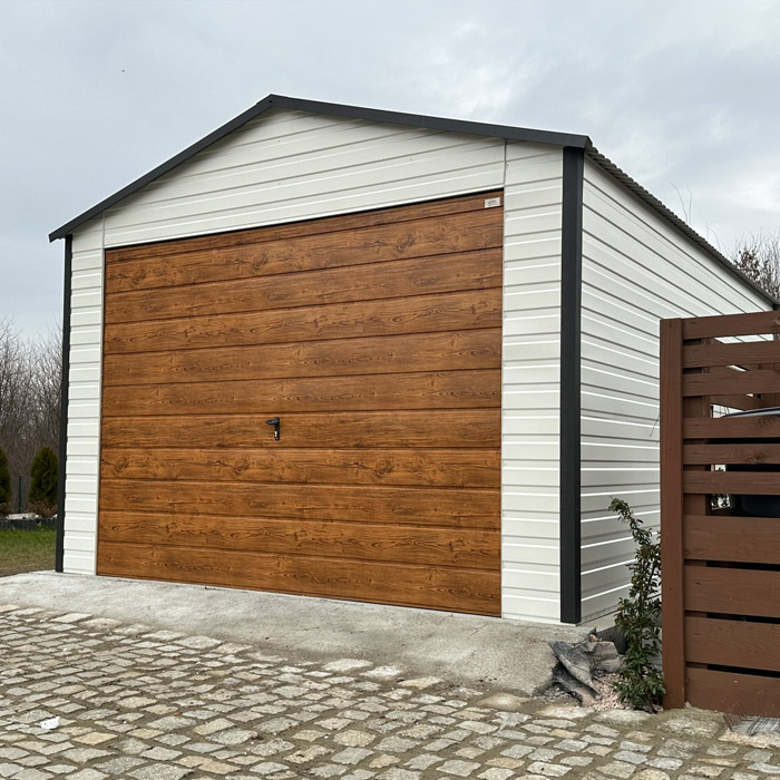 Garaż 4×5 dwuspadowy, blacha w kolorze akrylowym – białym. Blacha w przetłoczeniu poziomym wraz z obróbką blacharską narożników oraz dachu. Dach pokryty blachą T14 w kolorze grafit mat. Konstrukcja garażu wykonana z profilu zamkniętego ocynkowanego. Blacha przymocowana nitami w kolorze blachy.
