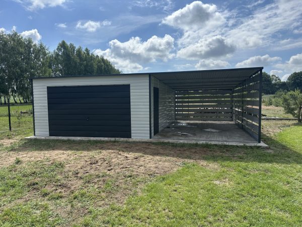Garaż 4×5 z zabudowaną wiatą 3,5×5 m to nowoczesne, estetyczne i wyjątkowo praktyczne rozwiązanie dla osób, które potrzebują nie tylko miejsca parkingowego, ale także dodatkowej przestrzeni użytkowej pod zadaszeniem. Ten kompletny zestaw łączy funkcję zamkniętego garażu z otwarto–zabudowaną wiatą, tworząc wielofunkcyjną strefę przydomową.