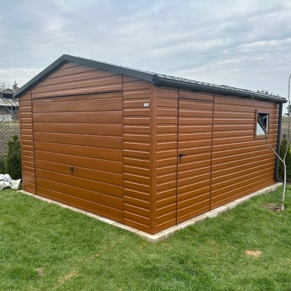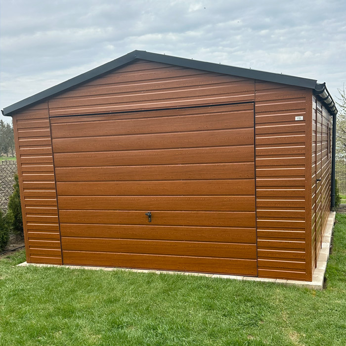 Garaż 4×6, dach dwuspadowy, blacha w kolorze drewnopodobnym (złoty dąb). Blacha w przetłoczeniu poziomym wraz z obróbką blacharską narożników oraz dachu. Dach pokryty blachodachówką w kolorze grafit mat. Konstrukcja garażu wykonana z profilu zamkniętego ocynkowanego. Blacha przymocowana nitami w kolorze blachy.
