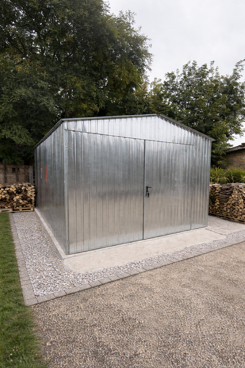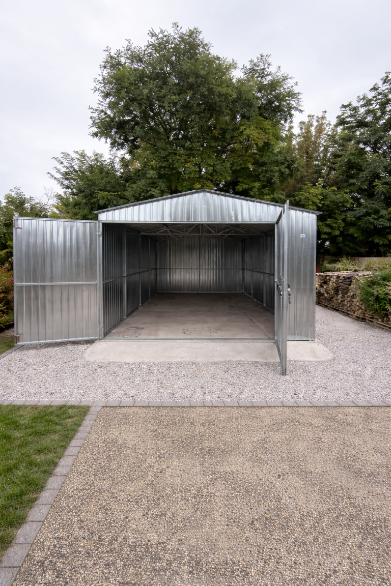 Garaż 4×6 m ocynk w konstrukcji dwuspadowej stanowi praktyczne rozwiązanie do przechowywania auta, narzędzi lub sprzętu. Brama dwuskrzydłowa ułatwia wjazd i wygodny dostęp do wnętrza. Przetłoczenie pionowe nadają estetyczny wygląd. Konstrukcja wykonana z profili zamkniętych. To tańsza wersja garażu, która łączy oszczędność z funkcjonalnością oraz trwałością.