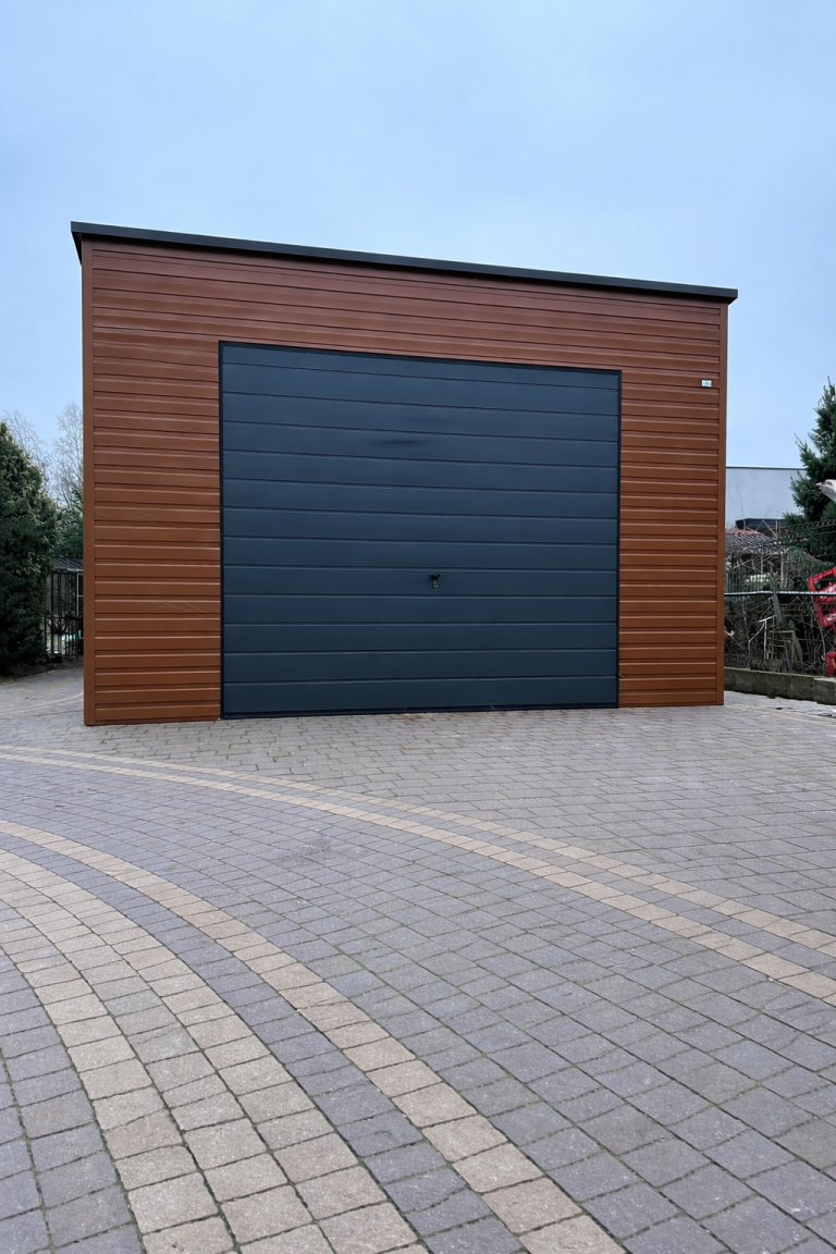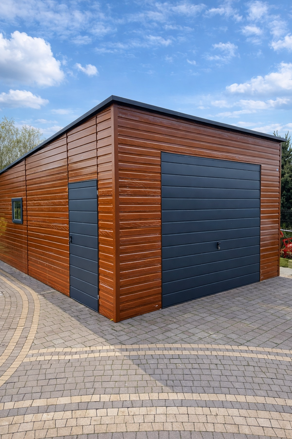 Garaż 5×8 m hala – przestronne i wygodne miejsce dla twojej pracy. Podwyższony garaż ze spadem do tyłu. Brama uchylna o wysokim świetle wjazdu. Dodatkowe drzwi i okno. Kolor drewnopodobny ( złoty dąb) + akrylowy ( grafit). Przetłoczenia poziome panel T7 na ścianach oraz T17 na bramie i drzwiach. Okucia narożników ścian i dachu.