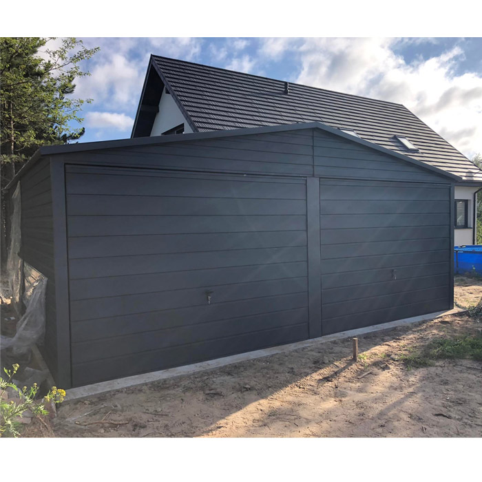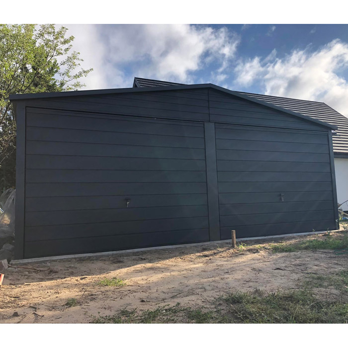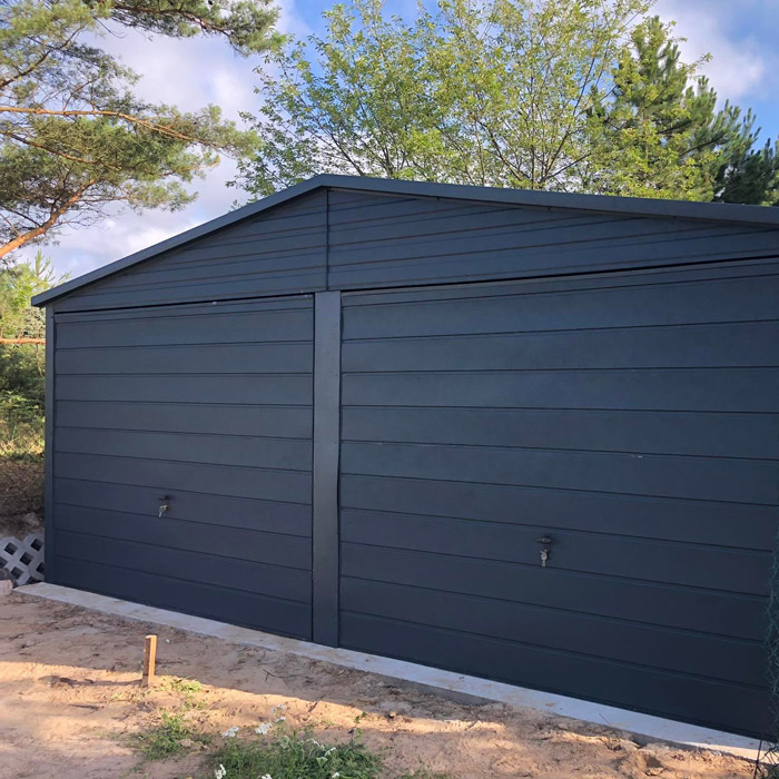 Garaż 6×6, dach dwuspadowy, blacha w kolorze grafit mat. Blacha w przetłoczeniu poziomym wraz z obróbką blacharską narożników oraz dachu. Konstrukcja garażu wykonana z profilu zamkniętego ocynkowanego. Blacha przymocowana nitami w kolorze blachy. Możliwość zmiany koloru oraz dodatków.