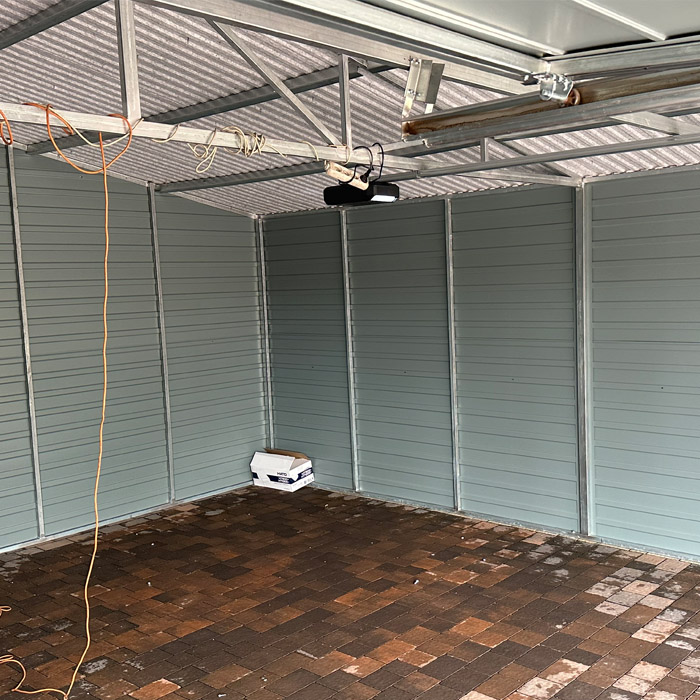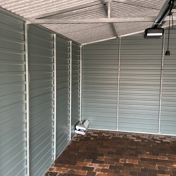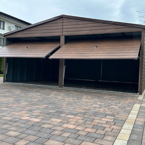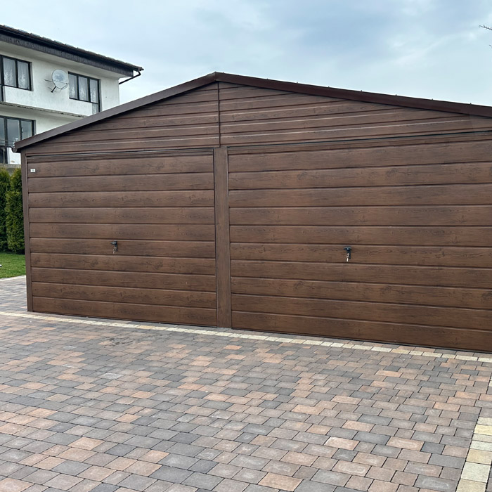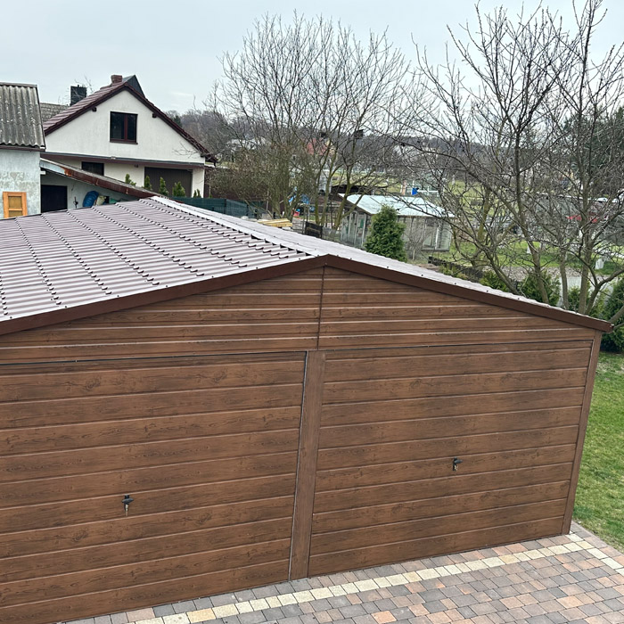 Garaż 6×6 dwuspadowy, blacha w kolorze drewnopodobnym (ciemny orzech). Blacha w przetłoczeniu poziomym wraz z obróbką blacharską narożników oraz dachu. Dach pokryty blachodachówką w kolorze brąz mat. Konstrukcja garażu wykonana z profilu zamkniętego ocynkowanego. Blacha przymocowana nitami w kolorze blachy.