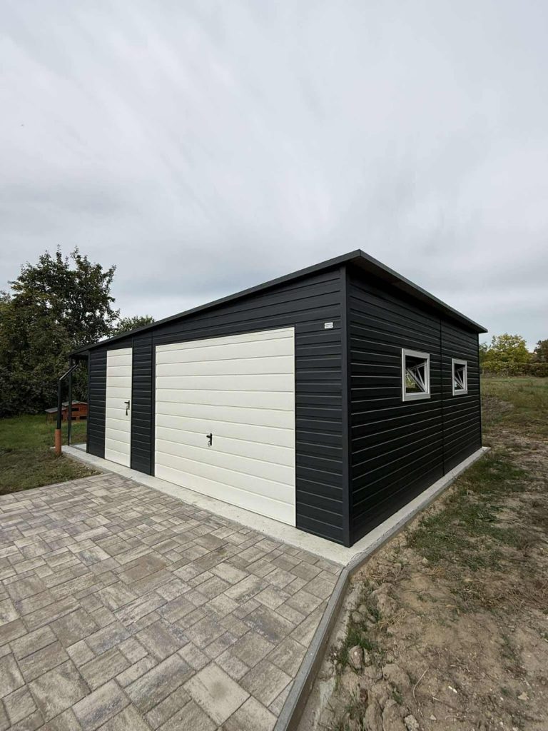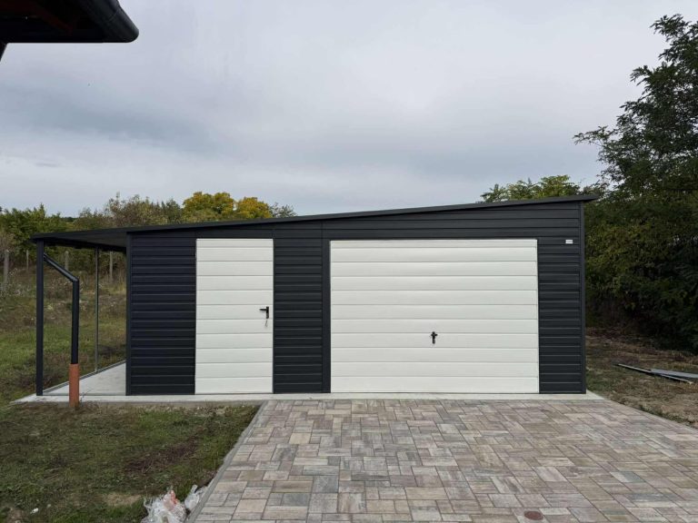 Garaż 6×6 m z wiatą 1,5×6 m – całość tworzy funkcjonalny, estetyczny i praktyczny garaż z dodatkową przestrzenią zadaszoną, idealny zarówno do parkowania pojazdów, jak i przechowywania sprzętu.