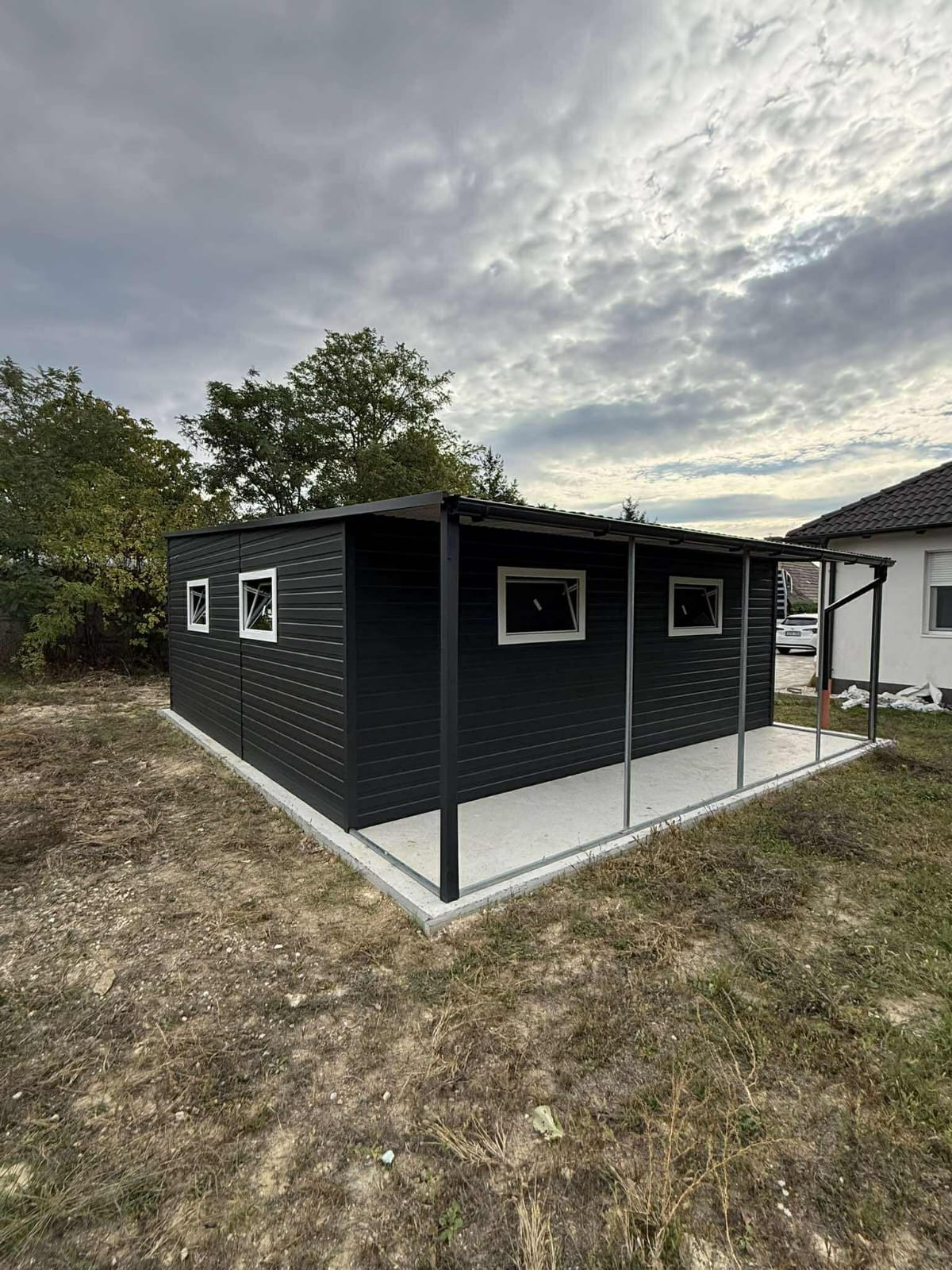 Przedmiotem jest nowoczesny garaż blaszany o wymiarach 6 m szerokości i 6 m długości, wyposażony w dodatkową wiatę boczną o wymiarach 1,5 m × 6 m, która może służyć jako zadaszone miejsce na drewno, rowery, sprzęt ogrodowy.