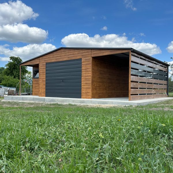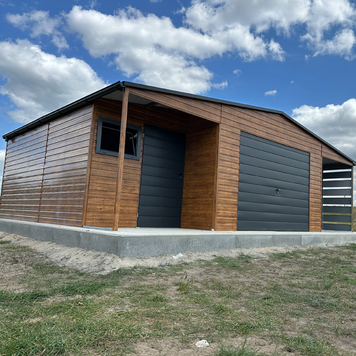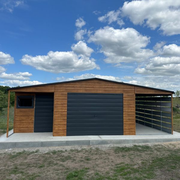 Garaż 6×6 + wiata z blachy panelowej 2×6. Dach dwuspadowy, blacha w kolorze drewnopodobnym (jasny orzech), brama, drzwi, okno, dach w kolorze grafit mat. Blacha w przetłoczeniu poziomym wraz z obróbką blacharską narożników oraz dachu. Konstrukcja garażu wykonana z profilu zamkniętego ocynkowanego. Blacha przymocowana nitami w kolorze blachy.