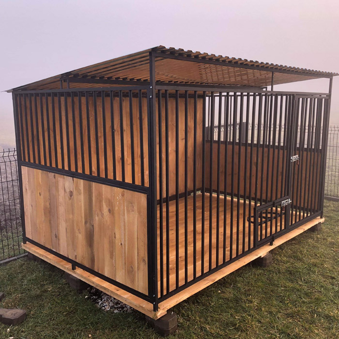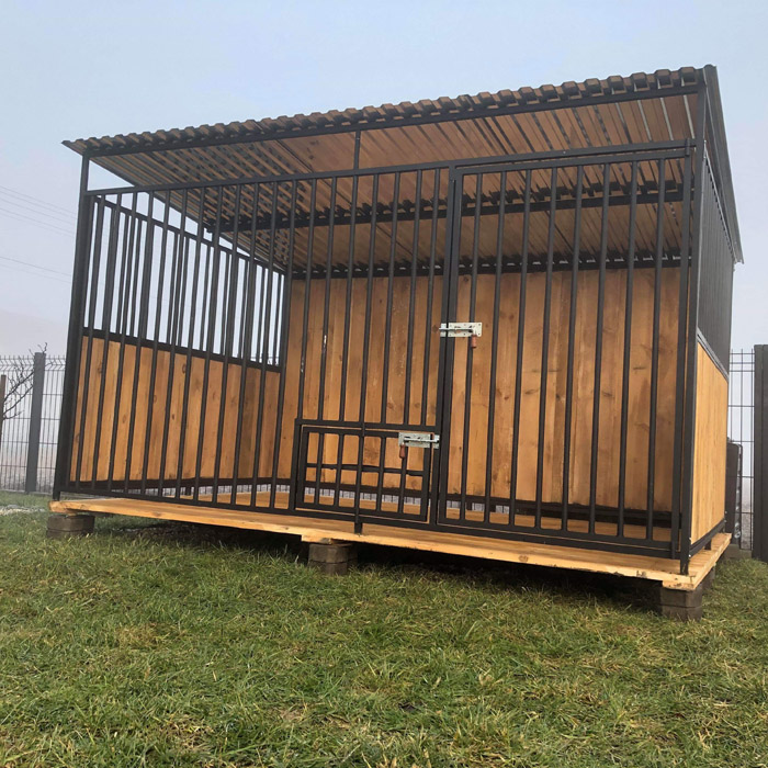 Kojec 3×2, konstrukcja kojca wykonana z profilu zamkniętego 20×20 w ściance 1,5mm, szczeble w kojcu wykonane z rurki fi 18 w ściance 1,5mm. Pomalowany farbą podkładową antykorozyjną w kolorze czarnym (możliwość zmiany koloru). Kojec posiada nóżki 5cm w celu możliwości lepszego sprzątania w środku. Box wyposażony jest w zamknięcie ( zasuwka z sprężyną).